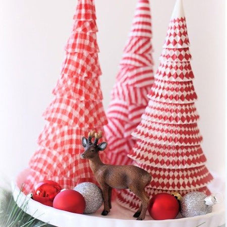 Make colourful Christmas tree decorations with cupcake liners. To make, simply cut down the side of each liner and remove the base. Make or buy a cardboard cone and starting at the bottom, wrap a cut cupcake liner around the tree, securing the ends with sewing pins or hot glue. Cover the entire cone and add more strips - overlapping slightly and alternating patterns - until you reach the top. For the top of the tree roll a small pleated piece and insert it inside a slightly larger strip and then pin to treetop.