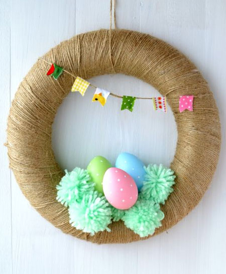 An even easier Easter wreath to make has eggs painted in Easter colours combined with colourful pom poms. Use a hot glue gun to attach these onto your foam wreath wrapped with twine or string.