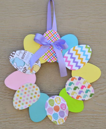 Wreaths are always a popular choice for Easter and this wooden Easter wreath is easy to cut out of a piece of Masonite with a jigsaw. Once you have cut out the shape, cut out colourful patterned paper to stick on, and embellish with ribbons.