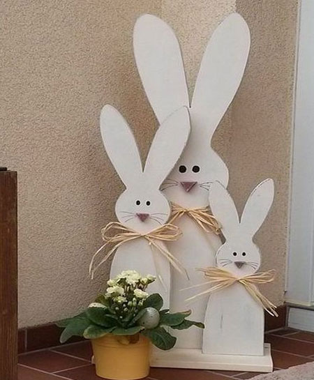 Here's another easy project for those with basic DIY skills. Use a jigsaw to cut out the shapes in a piece of Masonite or hardboard and paint on a bunny design. Glue these onto a solid block and place at your entrance or in a hallway where guests will be able to enjoy them.