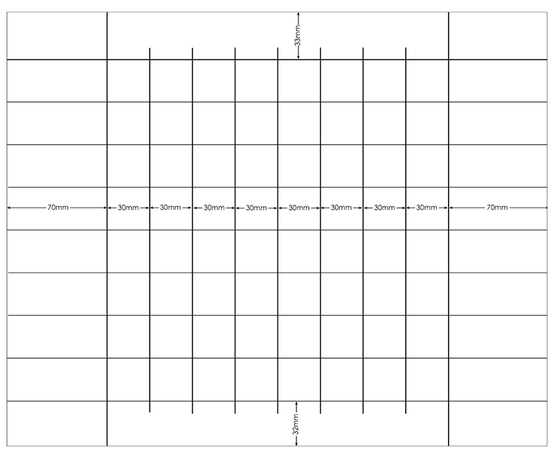 E. Work from top to bottom starting at the 33mm line and draw horizontal lines at 63, 93, 123, 153, 183, 213, 243, 273mm.