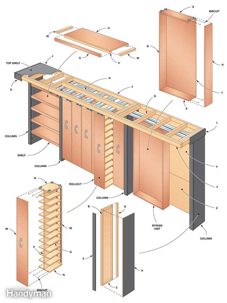 We stained the columns and trim black, and the face of the rollouts and the bypass unit with brown stain. When the stain was dry, we brushed two coats of polyurethane sealer over the whole works to provide a little sheen and extra protection. If you plan to stain and finish the storage unit, consider doing it before you assemble the parts. It’ll save you a lot of time and effort.