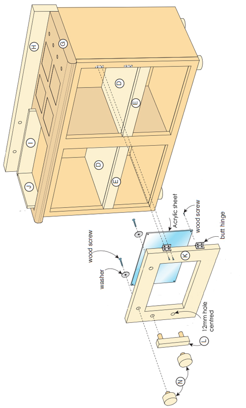 1. Make any adjustments to the door (K) to fit and mark out the positions for fitting the knob, handle and opening for the perspex panel. In the door use a 10mm wood bit to drill clearance holes for a jigsaw blade. Cut out the opening and sand smooth.