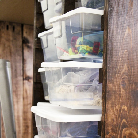 This storage unit is a very basic design that allows for you to add plastic tubs or bins. The nice thing is that you can make this design to fit almost any size of plastic container.